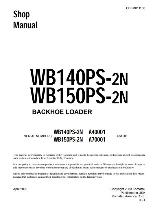 Enhance your maintenance capabilities with the Komatsu WB140PS-2N and WB150PS-2N USA Backhoe Loader Workshop Manual. This comprehensive guide provides detailed instructions, diagrams, and troubleshooting tips specifically designed for these models, ensuring you can perform repairs and maintenance with confidence. With this manual, you’ll save time and money by tackling issues in-house, keeping your backhoe loader in optimal working condition for all your projects. Invest in this essential resource to maximize the performance and longevity of your equipment