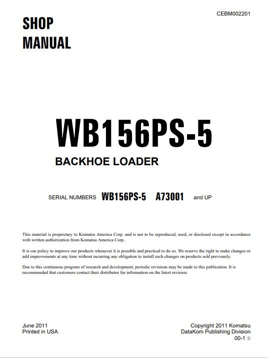 Enhance your maintenance capabilities with the Komatsu WB156PS-5 USA Backhoe Loader Workshop Manual. This comprehensive guide provides detailed instructions, diagrams, and troubleshooting tips specifically designed for the WB156PS-5 model, ensuring you can efficiently service and repair your equipment. With this manual, you’ll save time and reduce downtime, maximizing productivity on the job site. Invest in your machinery’s longevity and performance with this essential resource for operators and technicians alike