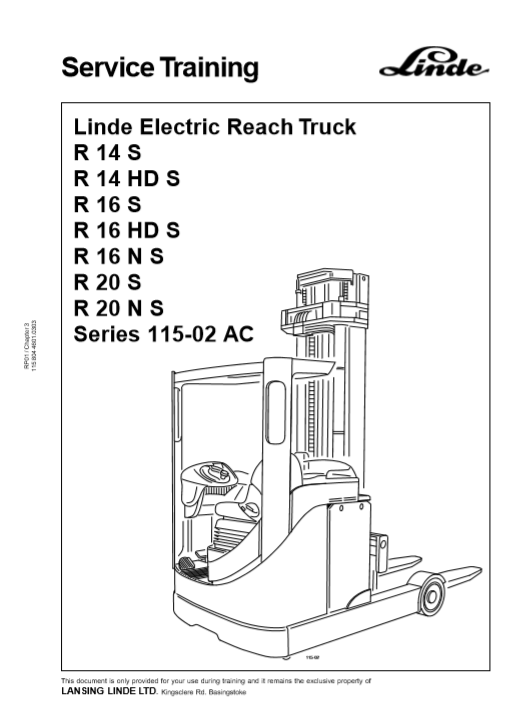 Linde R16S Electric Reach Truck Service Training Manual, displaying the truck and essential training details for operatorsLinde R16S Electric Reach Truck Service Training Manual