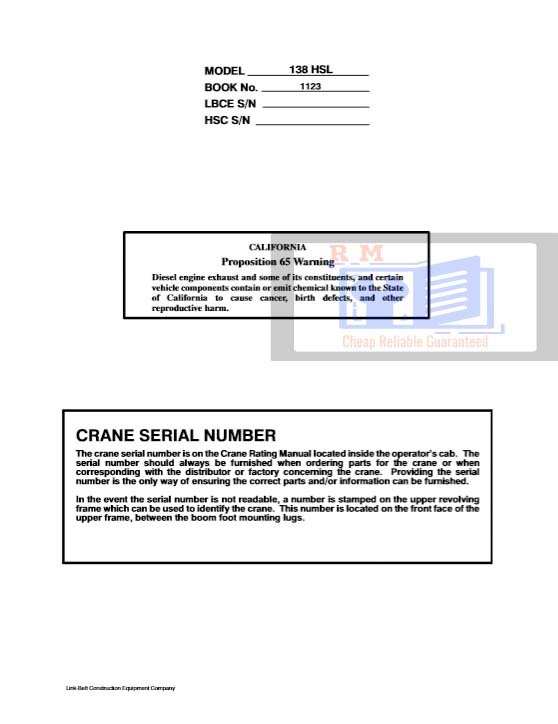 Whether you’re performing a quick service or a complete overhaul, this manual is your essential companion for maximizing the performance and longevity of your Link Belt 138HSL Crane