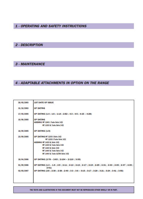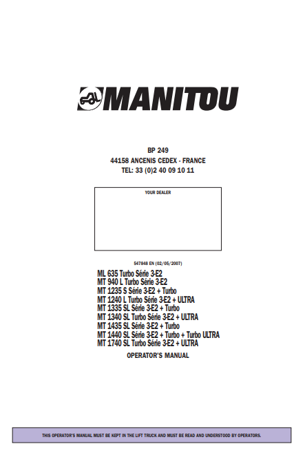 Comprehensive operators manual for the Manitou ML 635 to MT 1740 Telehandler, including safety and operational proceduresManitou ML 635 to MT 1740 Telehandler Operators Manual
