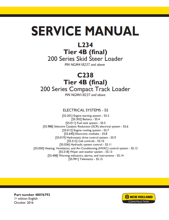 New Holland L234 Tier 4B (final) 200 Series Skid Steer Loader, C238 Tier 4B (final) 200 Series Compact Track Loader Service Manual (Part # 48076792)