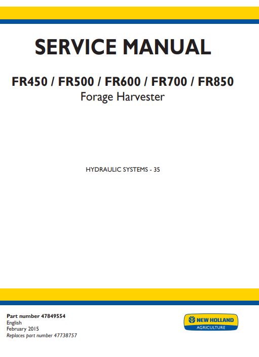 Repair manual detailing hydraulic systems for New Holland FR450, FR500, FR600, FR700, and FR850 forage harvestersNew Holland FR450, New Holland FR500, New Holland FR600, New Holland FR700, New Holland FR850 Forage Harvester Service Repair Manual (Hydraulic systems)