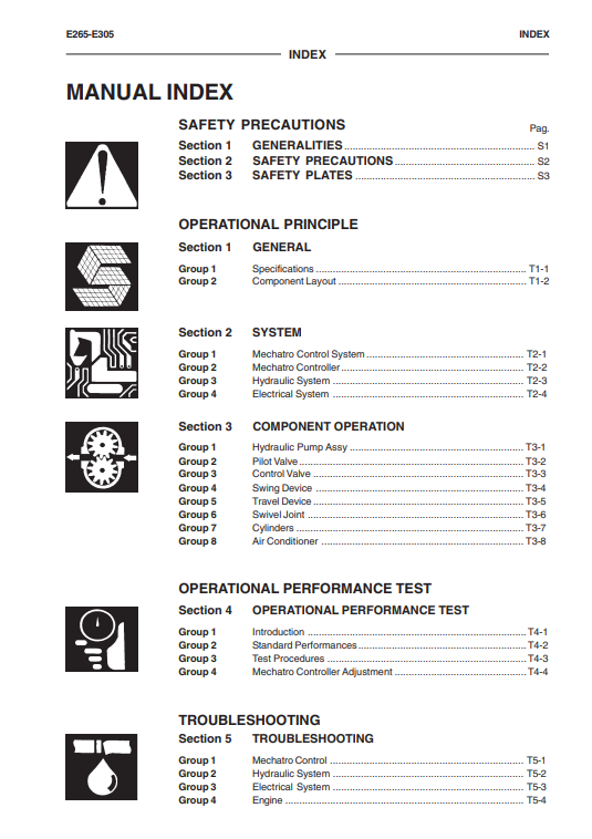 Workshop manual for New Holland E265 and E305 excavators, showcasing diagrams and maintenance guidelinesNew Holland E265, New Holland E305 Excavator Workshop Manual