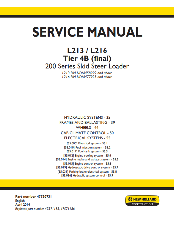New Holland L213, L216 Tier 4B (final) 200 Series Skid Steer Loader Service Manual (Part Number 47720731)