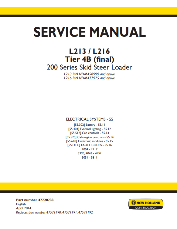 New Holland L213, L216 Tier 4B (final) 200 Series Skid Steer Loader Service Manual (Part Number 47720733)
