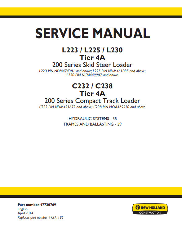 New Holland L223, L225, L230 Tier 4A 200 Series Skid Steer Loader / C232, C238 Tier 4A 200 Series Compact Track Loader Service Manual