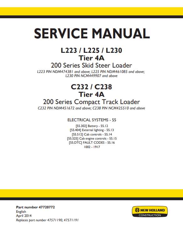 New Holland L223, L225, L230 Tier 4A 200 Series Skid Steer Loader / C232, C238 Tier 4A 200 Series Compact Track Loader Service Manual