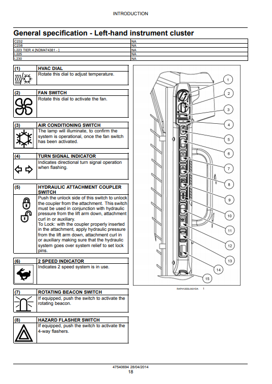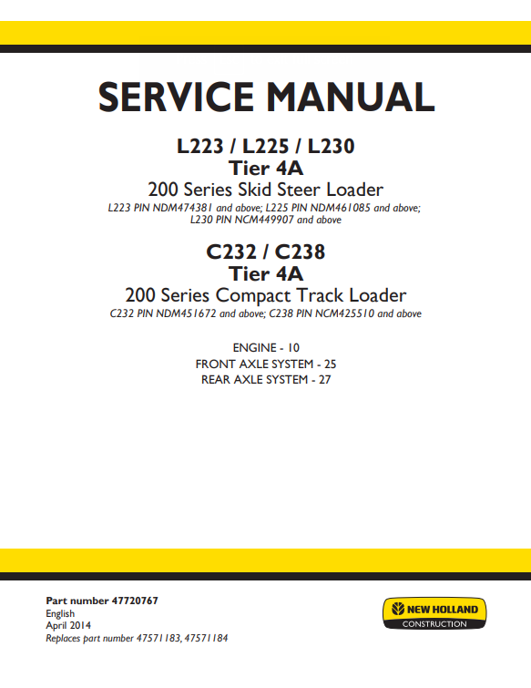 New Holland L223, L225, L230 Tier 4A 200 Series Skid Steer Loader / C232, C238 Tier 4A 200 Series Compact Track Loader Service Manual (Part Number 47720767)