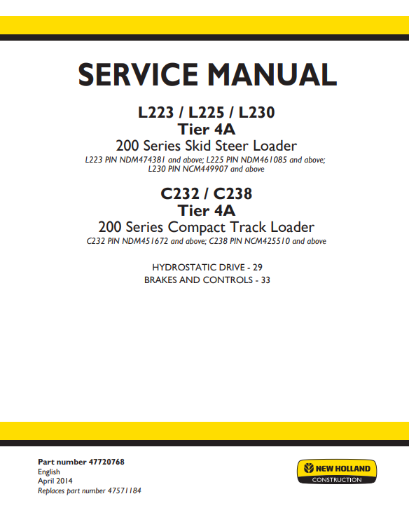 New Holland L223, L225, L230 Tier 4A 200 Series Skid Steer Loader / C232, C238 Tier 4A 200 Series Compact Track Loader Service Manual (Part Number 47720768)