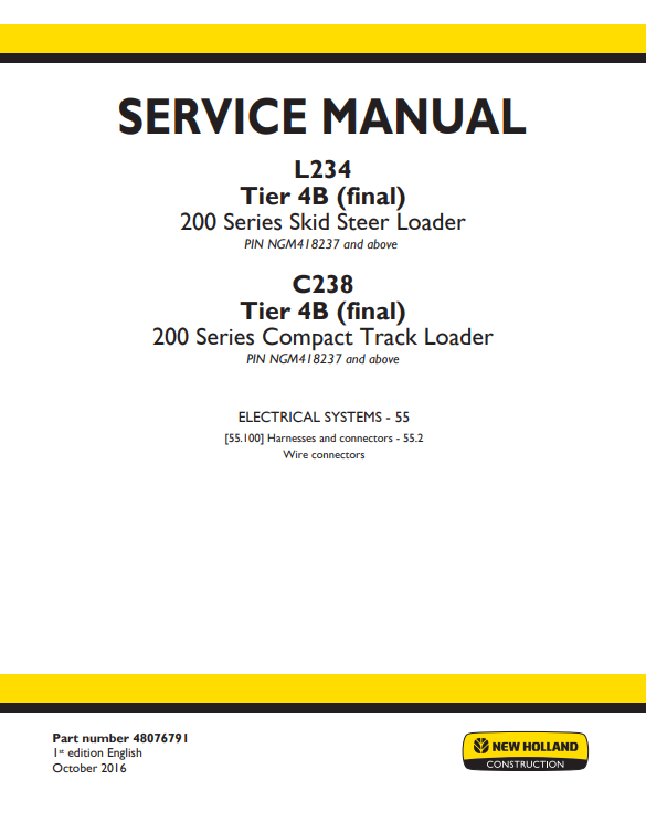 New Holland L234 Tier 4B (final) 200 Series Skid Steer Loader / C238 Tier 4B (final) 200 Series Compact Track Loader Service Manual (Part # 48076791)
