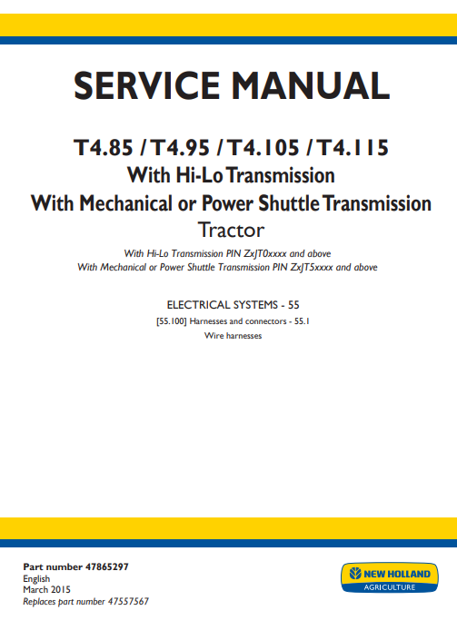 NEW HOLLAND T4.85, T4.95, T4.105, T4.115 Tractor Service Repair Manual (Electrical systems Wire harnesses)