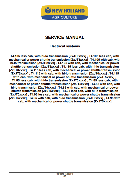 Ensure your New Holland T4 series tractor operates at peak performance with the comprehensive Service Repair Manual for models T4.85, T4.95, T4.105, and T4.115. This essential guide provides detailed insights into electrical systems and wire harnesses, empowering you to troubleshoot and repair with confidence. With clear diagrams and step-by-step instructions, you can save time and money on maintenance, ensuring your tractor remains reliable and efficient for all your agricultural needs. Invest in this manual today and keep your equipment running smoothly for years to come