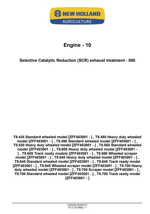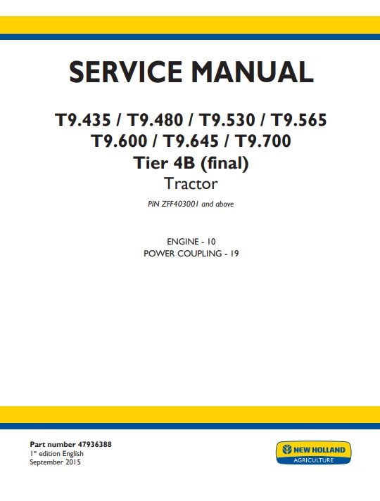 The NEW HOLLAND T9.435, T9.480, T9.530, T9.565, T9.600, T9.645, and T9.700 Tier 4B Service Manual is an essential resource for maintaining the performance and longevity of your equipment. This comprehensive guide provides detailed instructions, diagrams, and troubleshooting tips tailored specifically for these powerful tractors, ensuring you can efficiently address any service needs. With this manual, you can enhance your operational efficiency and minimize downtime, making it a must-have for any serious operator or technician