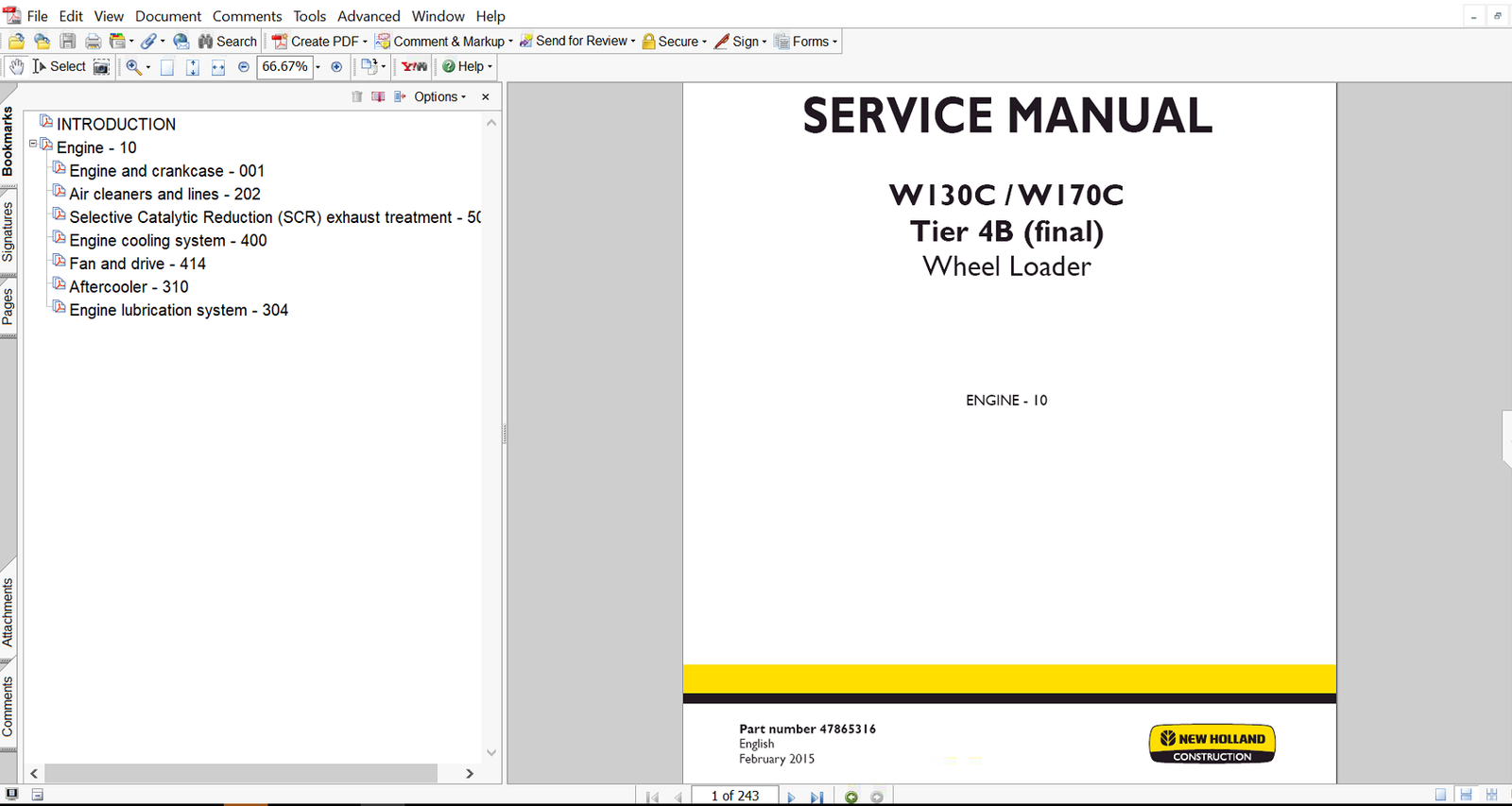 Whether you’re performing a quick service or a complete overhaul, this manual is your essential companion for maximizing the performance and longevity of your New Holland W130C Wheel Loader Engine