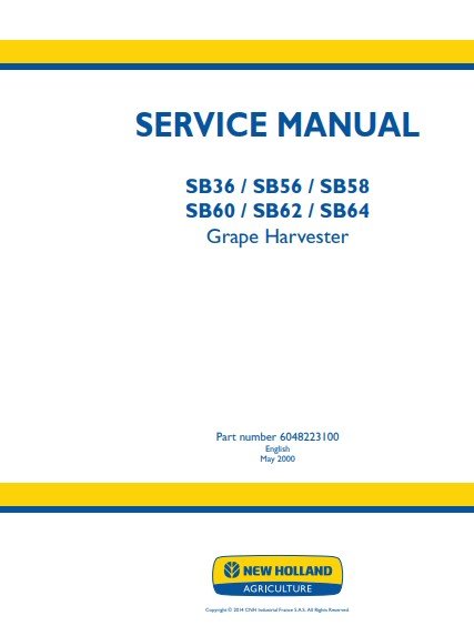 Ensure your New Holland grape harvester operates at peak performance with the SB36, SB56, SB58, SB60, SB62, and SB64 Service Repair Manual. This comprehensive guide provides detailed instructions, diagrams, and troubleshooting tips tailored specifically for your model, making maintenance and repairs straightforward and efficient. With this manual, you can save time and money by tackling repairs yourself, ensuring your equipment remains reliable during the critical harvest season. Invest in the longevity of your grape harvester and enhance your productivity with this essential resource