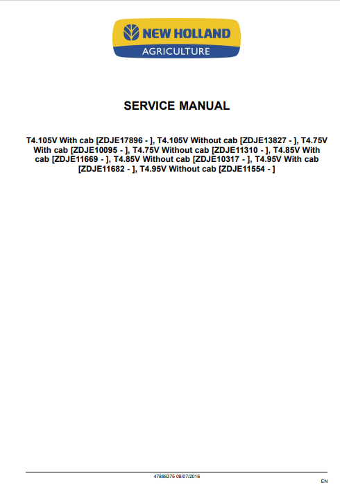 NEW HOLLAND T4.75V, T4.85V, T4.95V, T4.105V Tier 3 Tractor Service Repair Manual