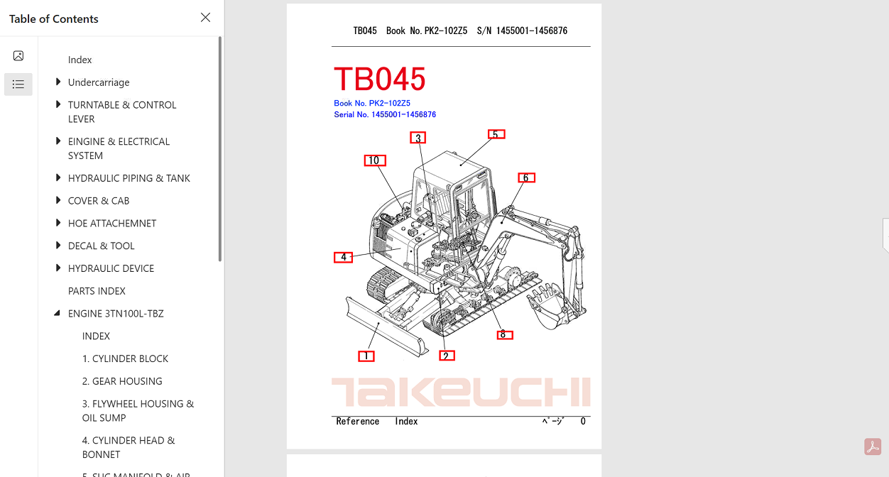 The Takeuchi TB045 Excavator Parts Manual is an essential resource for anyone looking to maintain or repair their TB045 excavator with precision and confidence. This comprehensive manual provides detailed diagrams, part numbers, and specifications for all components of the excavator, ensuring that you can easily identify and source the correct parts for your machine. With clear illustrations and step-by-step instructions, this manual simplifies the repair process, saving you time and reducing the risk of costly mistakes. Whether you are a seasoned mechanic or a DIY enthusiast, the Takeuchi TB045 Parts Manual is designed to enhance your understanding of the excavator’s systems, enabling you to keep your equipment running smoothly and efficiently. Invest in this invaluable guide today and ensure your excavator remains in peak condition for all your construction and excavation needs