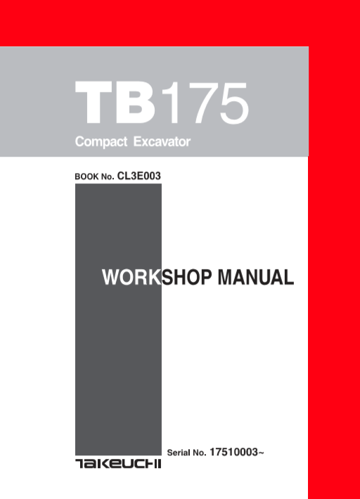 The Takeuchi TB175 Excavator Workshop Repair Manual is an essential resource for any technician or DIY enthusiast looking to maintain or repair their TB175 excavator with confidence. This comprehensive manual provides detailed instructions, schematics, and troubleshooting tips that cover every aspect of the machine, from engine diagnostics to hydraulic system maintenance. With clear illustrations and step-by-step procedures, users can easily navigate complex repairs and ensure optimal performance of their equipment. Whether you are performing routine maintenance or tackling more extensive repairs, this manual is designed to save you time and money by empowering you with the knowledge needed to keep your excavator running smoothly. Invest in the Takeuchi TB175 Excavator Workshop Repair Manual today and experience the peace of mind that comes with having expert guidance at your fingertips