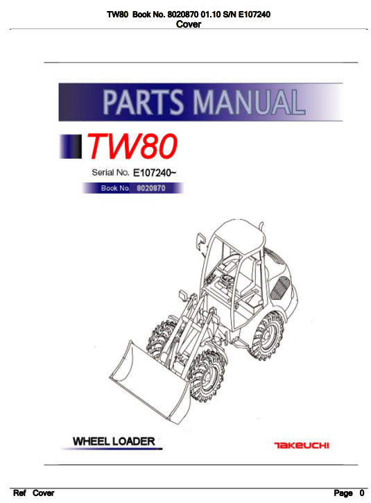 The Takeuchi TW80 Wheel Loader Parts Manual is an essential resource for anyone looking to maintain or repair their equipment with precision and confidence. This comprehensive manual provides detailed diagrams, part numbers, and specifications for every component of the TW80, ensuring that you can easily identify and source the correct parts for your machine. With clear illustrations and step-by-step instructions, this manual simplifies the process of troubleshooting and repairs, saving you time and reducing downtime. Whether you are a seasoned technician or a DIY enthusiast, the Takeuchi TW80 Parts Manual is your go-to guide for keeping your wheel loader in optimal working condition, enhancing its performance and longevity. Invest in this invaluable tool today and ensure your equipment operates at its best for years to come