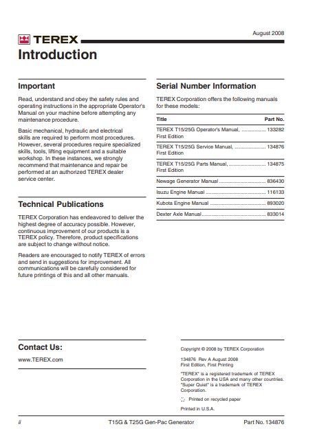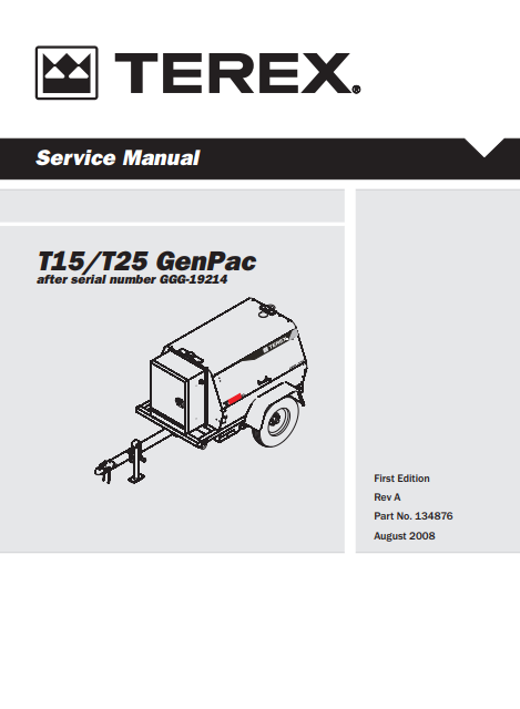 The Terex T15 and T25 GenPac Service Manual is an essential resource for maintaining and troubleshooting your equipment. This comprehensive guide provides detailed instructions, diagrams, and specifications to ensure optimal performance and longevity of your Terex generators. With clear, step-by-step procedures, you can confidently address any service needs, minimizing downtime and maximizing efficiency. Invest in this manual to empower your maintenance efforts and keep your Terex equipment running smoothly