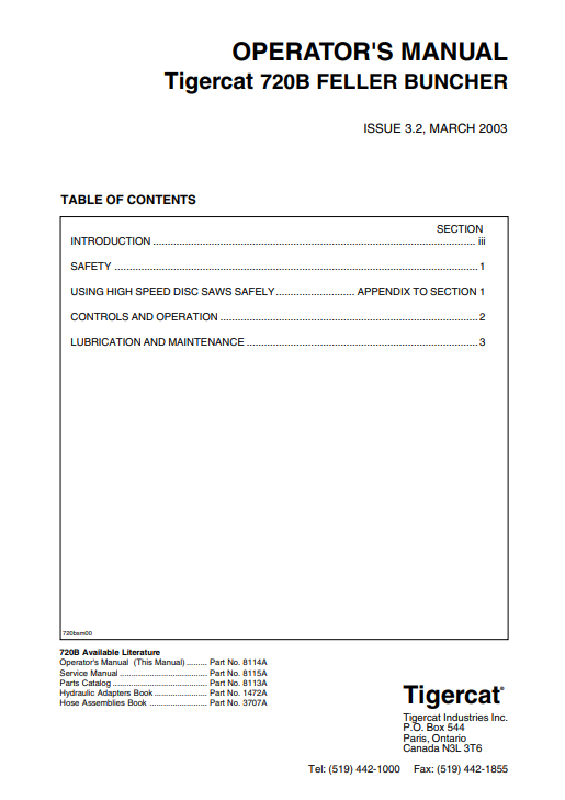 Tigercat 720B Feller Buncher Operator’s Manual