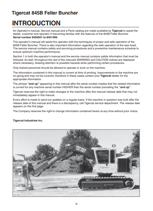 Tigercat 845B Feller Buncher service repair manual cover featuring the machine and technical illustrationsTigercat 845B Feller Buncher Service Repair Manual
