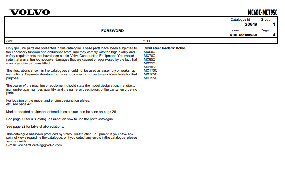 Volvo MC60C, MCT95C SkidSteer Loader Parts Catalog