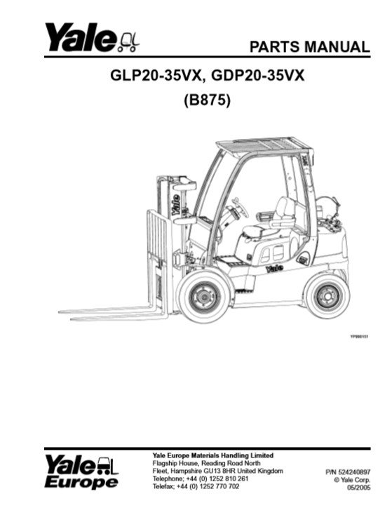 Parts manual for Yale GLP20-35VX and GDP20-35VX forklifts, detailing components and specifications for maintenanceYale GLP20-35VX, GDP20-35VX (B875) Forklift Parts Manual